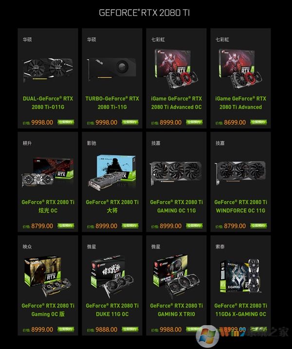 GTX2080TI的价格就比较差不多了,都是8999-到9998这样子,还是华硕最贵。