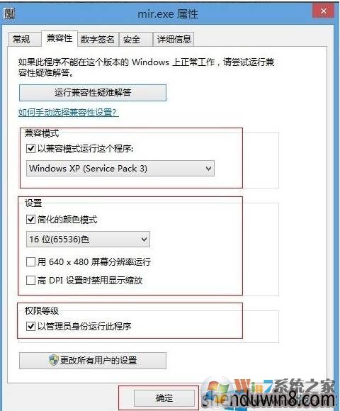 2、然后点击兼容性选项卡,在兼容模式下的:以兼容模式运行这个程序(前面打上钩钩)—选择:WinXP (Service Pack 3) —选择:设置(简化的颜色模式的前面打上钩钩)—把色彩位数修改为:16位(65536)色—最后在:权限等级那里打上钩钩—以管理员身份运行此程序