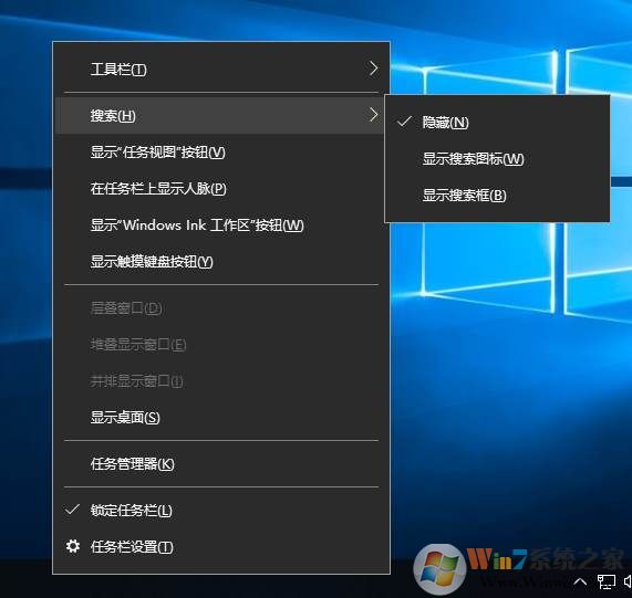 2、我们可以看到菜单里的搜索,右键指向搜索,就会出现: 隐藏、显示搜索图标、显示搜索框 三个选项;