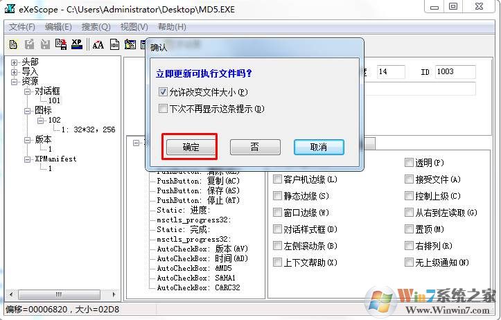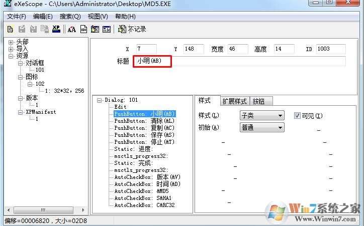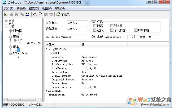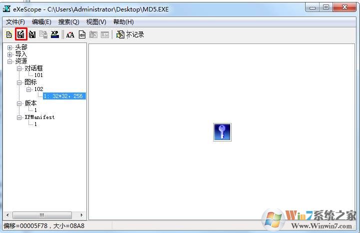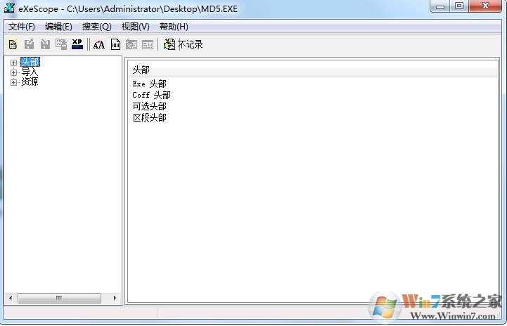 2、小编这次就简单的示范下如何改程序的图标、按钮名称吧。小编使用exescope打开了MD5.EXE这款检测MD5值的校检工具;如下图: