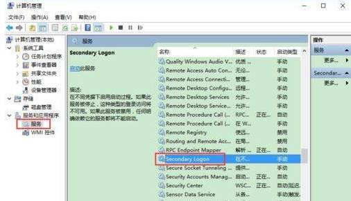 进入计算机管理,左侧导航里面依次点击“服务和应用程序”-“服务”,然后右侧找到“secondary logon”服务,并双击该服务。