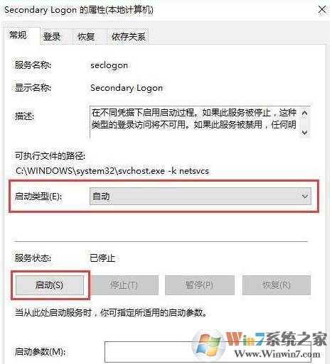 更改“启动类型”为自动,然后点击启动按钮,按下确定按钮,重启电脑即可开启secondary logon服务。