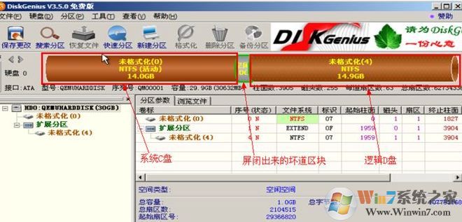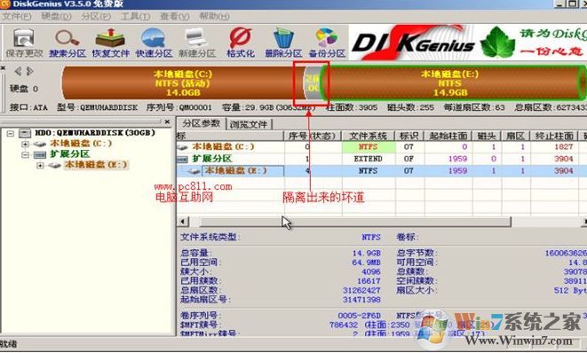 特别说明:之所有是14GB就是把剩下的0.49的空闲空间给扔掉,不分区也就达到了屏闭磁盘这个坏道的地步了。
