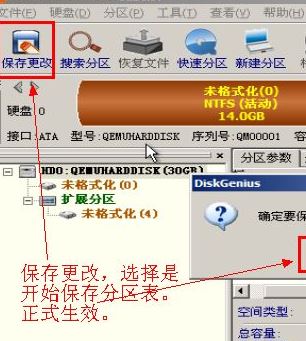 9、到了此步,并不是就已经完成了屏闭磁盘坏道,而是我们已经配置好了分区表,这里我们就需要保存我们做的配置了,单击左上角的【保存更改】,就会提示是否保存分区表,选择是,就再会提示需要格式化,再选择是。即可开始自动格式化磁盘。