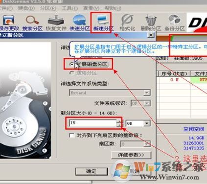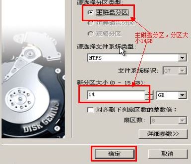 2、为什么要输入15GB呢?大家可能有些疑问,本文这里说一下,此步分区只是临时分一下,只要不确定就不会生效,只是先把这个坏道先占着位置,以供后面分区。当然如果有对扇位分区比较明了的话,可以在【建立新分区】这里单击详细参数,可以更大的详细分区。