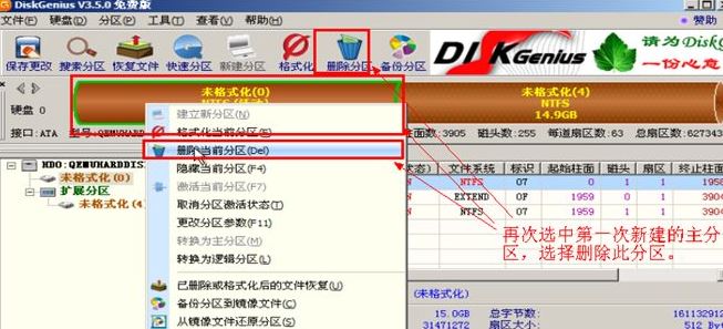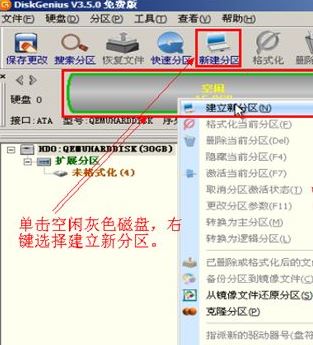 6.、删除掉主分区之后,再次单击未分配的灰色空闲分区,右键选择【建立新分区】或单击上面的【新建分区】是一样的效果。