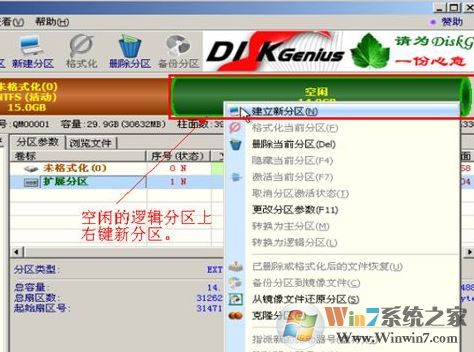 4、然后就和普通的分区方法一样了,我就大略的说一下,在逻辑分区上(也就是绿色标空闲的分区)上右键选择【建立新分区】。然后直接确定即可。