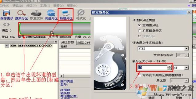 1、打开DiskGenius软件,选中出现坏道的磁盘,单击上面的【新建分区】或右键选择【新建分区】,在弹出的【建立新分区】窗口中,分区类型选择主磁盘分区,分区大小输入15数字。然后确定。