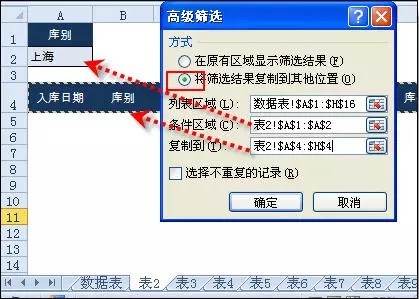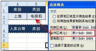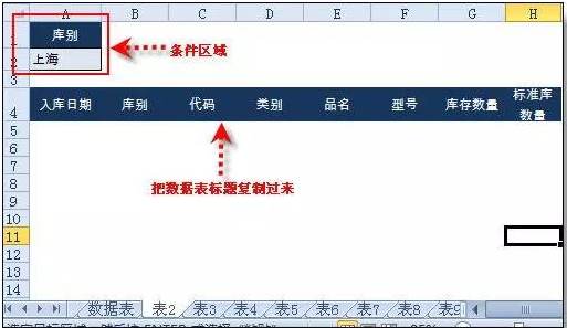 设置条件区域:在表2设置条件区域,第一行为标题“库别”,第二行输入“上海”,并把标题行复制到表2中任一行。