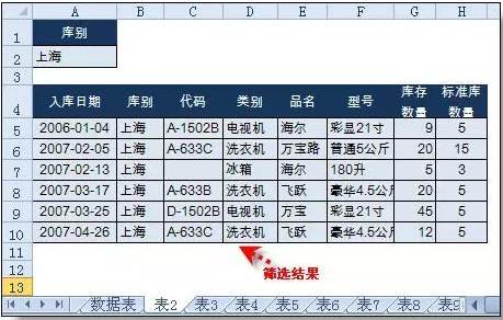 条件1:筛选“库别”为“上海”的行到表2中。