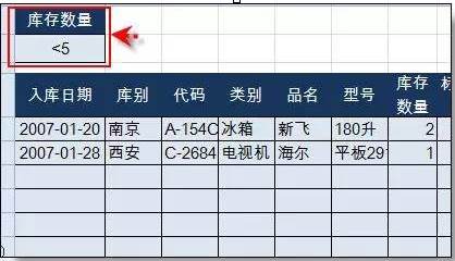条件5:筛选库存数量小于5的行