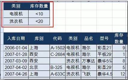 条件7:筛选 电视机库存<10台、洗衣机库存<20台的行