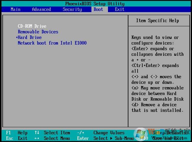 3、这时我们使用键盘方向键切换到“boot”选项,然后找到 CD-ROM Drive 选择后使用键盘上的 + 加号向上移动;