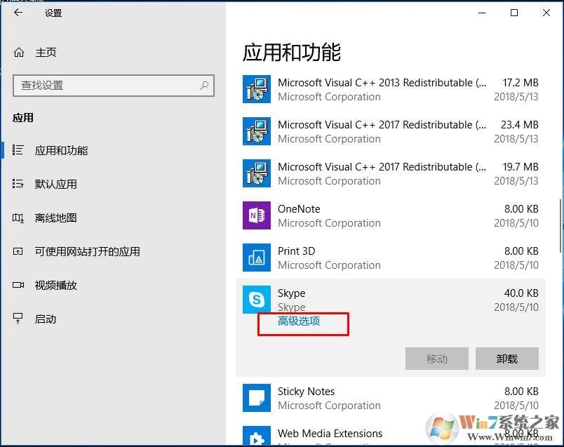3、在应用列表中找到要设置的应用,点击后选择“高级选项”;以skype为例