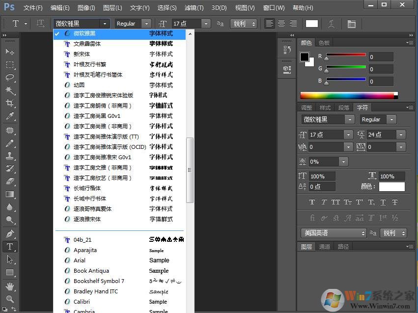 等到Win10字体安装完毕之后,我们再打开PS软件,就可以发现选择文字工具之后就能看到新安装的字体了。