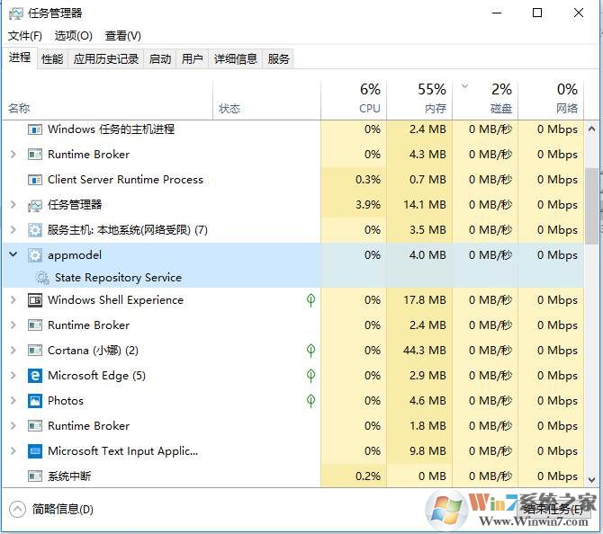 appmodel进程是win10系统中的应用商店里的管理程序,停止了没事。