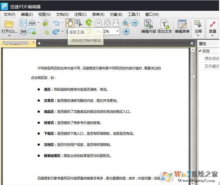 文档打开后有两种状态,一种是浏览状态,一种是编辑状态。刚打开文档时文档处于浏览状态,工具栏上默认选择的是手形工具。