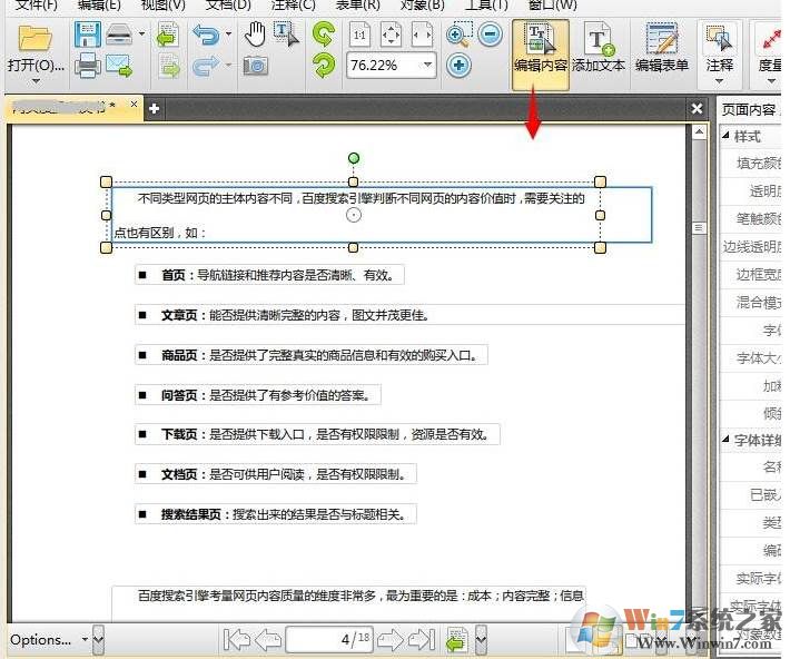 2、点击编辑内容工具后,文档就进入编辑状态,页面的内容可以进行编辑修改。点击对应的文本可以进入文本框中,对文字进行修改。文本框也可以进行调整。