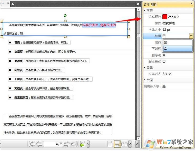 3、文本格式在右侧的属性窗格里面进行设置,当在文本框中选择文本内容后,在属性窗格中可以设置文本颜色、字体、大小等常规属性。