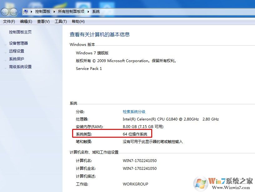 2、左键点击“属性”,弹出下图所示的“计算机的基本信息”框,在“系统类型”那一排你将会看到你的机器是32位还是64位。