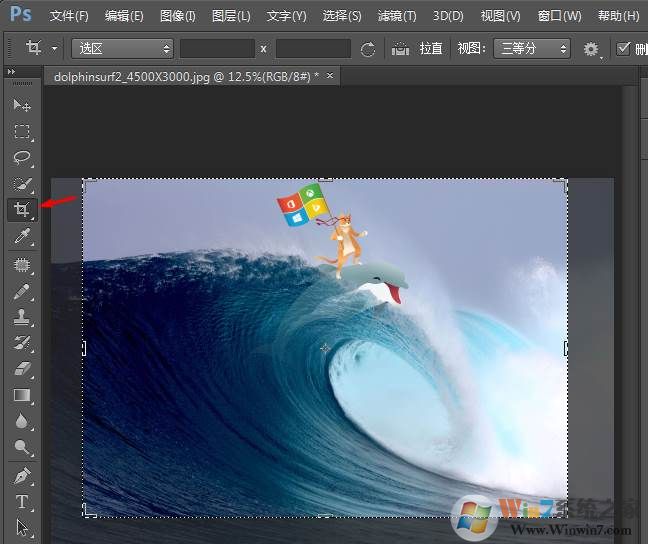 2、再用虚线框框选相片,选择好之后,再点击工具栏里的 裁切,这样就能裁剪好5寸比例的照片了;