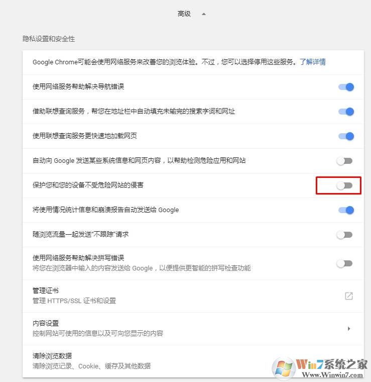 2、在高级设置下,找到 保护您和您的设备不受危险网站的侵害,关闭!