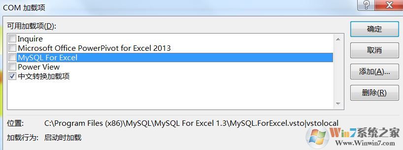 3、然后我们将“MySQL for Excel ”加载项的打√ 取消,点击确定即可!