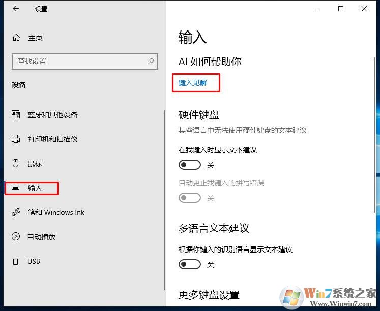 3、默认 键入见解是 开启的,如果要关闭点击关闭就可以。