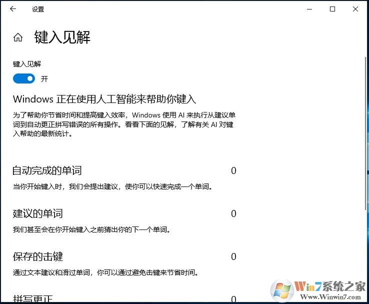 并且在下方还列举了 AI 对你输入帮助的统计信息。究竟“键入见解”有没有用,过些时间再来看看人工智能都帮助你完成了多少单词就知道了哦。