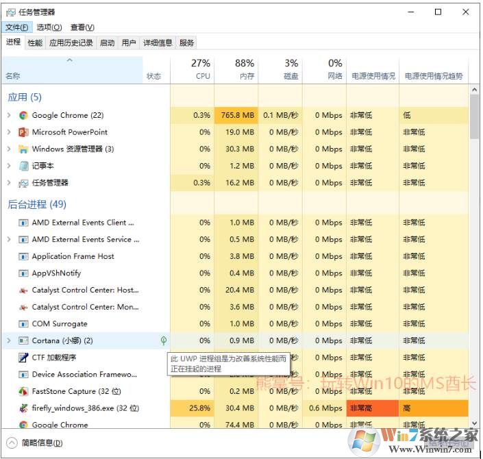 打开新版任务管理器,查看“详细信息”,你即可看到“电源使用情况”和“电源使用情况趋势”项目。如图: