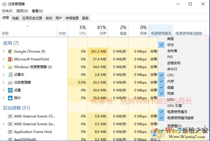如果你的任务管理器中没有看到电量使用情况的话,那么可以右键点击项目栏,在类型列表的底部勾选“电源使用情况”和“电源使用情况趋势”就可以查看到电量使用详细信息了。