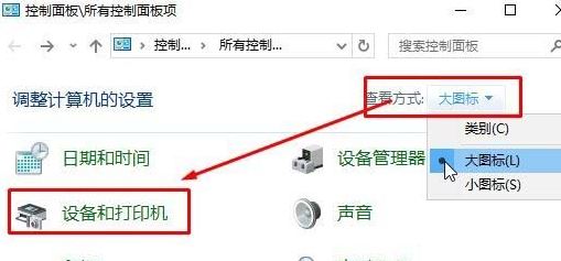 3、在控制面板右上角将查看方式修改为大图标,在打开设备和打印机;