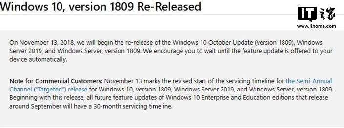 “在2018年11月13日,我们将开始重新发布Windows 10更新十月版(版本1809),Windows Server 2019和Windows Server版本1809,我们建议你等到提供给设备的自动功能更新,“微软在支持文件中说。