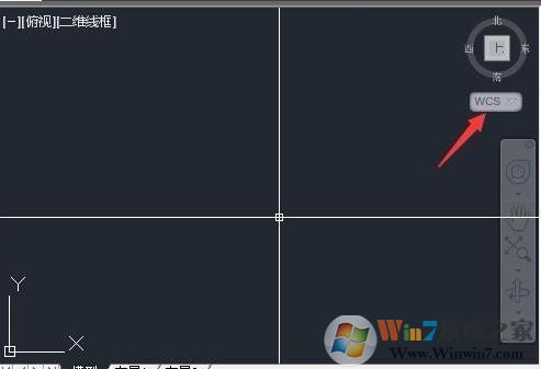 1、首先我们打开CAD软件,通过在模型空间绘图区域的右上角位置,可观察到视角功能模块,在视角模块下方可看到功能WCS,如图所示: