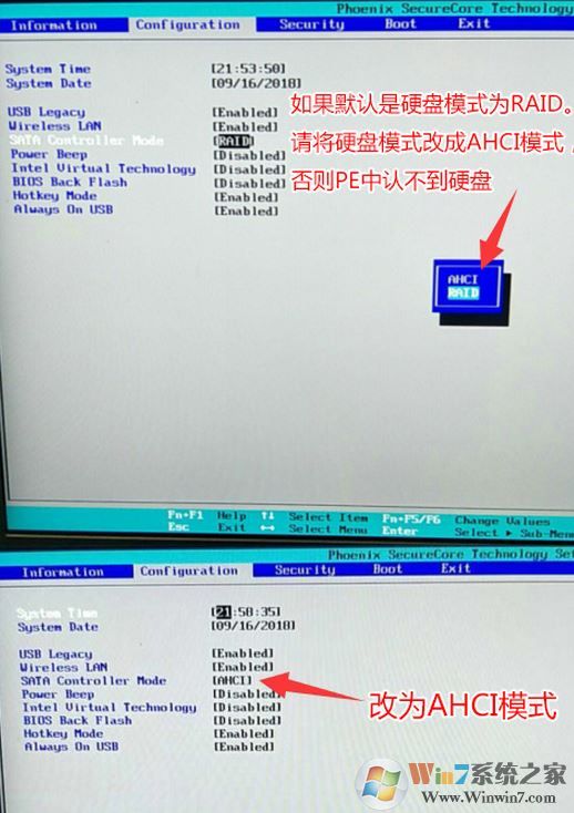6、注意:再返回configuration这项,查看sata controller mode这项,如果默认硬盘模式为RAID,请将硬盘模式改为AHCI模式,否则进PE后不能认出硬盘,如果更改后记得按F10保存,如下图所示;