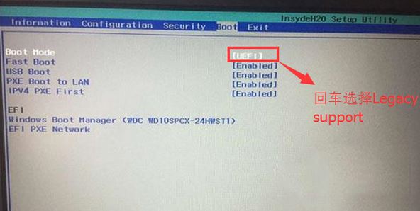 4、切换到Boot,把Boot Mode从UEFI改成Legacy Support,改传统引导,如下图所示;