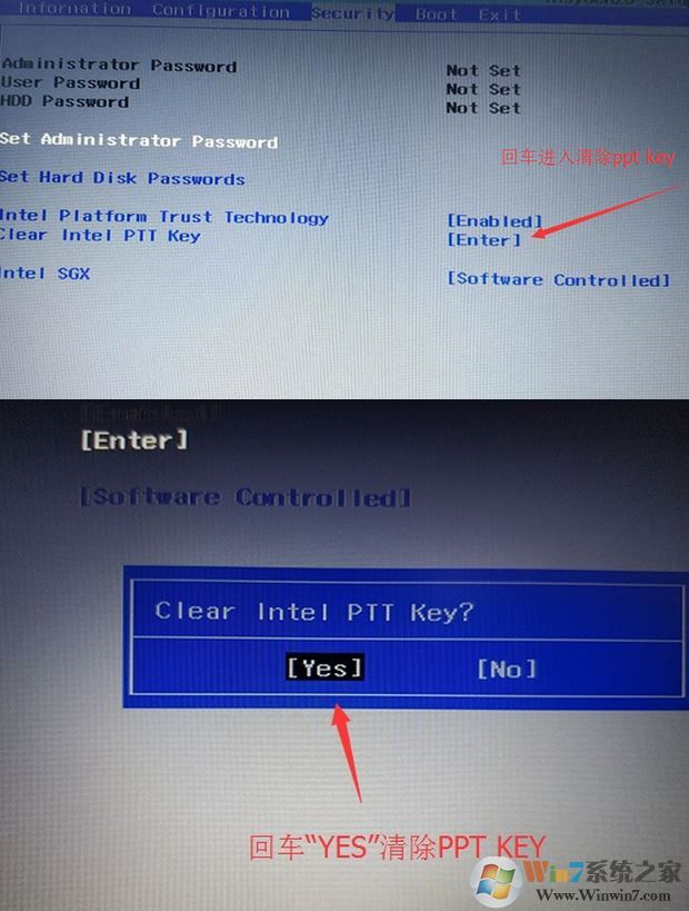 注:按如果Security选项下没有Secure Boot选项,看下是否有"clear intel PTT Key"选项,如果有进入回车选选择“yes”清除ppt key,否则无法安装系统后无法引导启动,如下图所示;