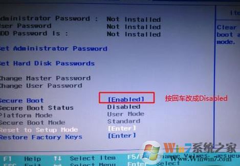1、开机一直按F2或(FN+F2)进入BIOS,按→方向键切换到Security,选择Secure Boot回车设置成Disabled,关闭安全启动,否则安装win7会失败,如下图所示;