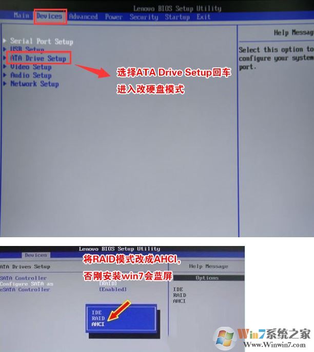 4、切将键盘移动Devices选项,把键盘移动ATA Drive Setup回车,将configure SATA as中默认的raid改成ahci模式,否则安装win7时会出现0x0000007b蓝屏,因为win7中没有集成raid硬盘驱动,然后选择F10保存设置,在弹出的选项中选择YES,如下图所示;