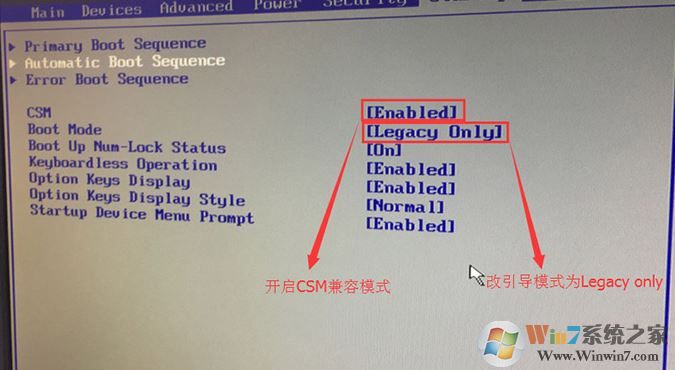 3、切换到Boot,把Boot Mode从UEFI改成Legacy only引导模式,再把csm默认disabled改成enabled,开启兼容模式,选择F10保存设置,在弹出的选项中选择YES;