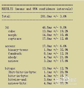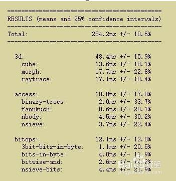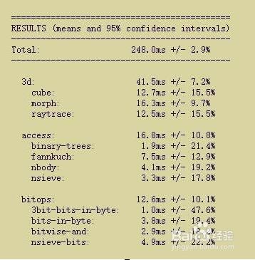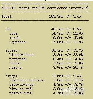 SunSpider JavaScript评分:各项数值最小越好(单位:毫秒)