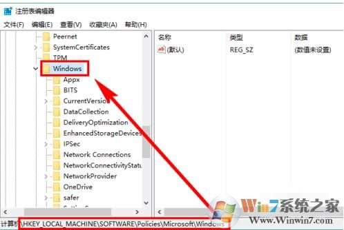 2、依次找到并点击【HKEY_LOCAL_MACHINE\SOFTWARE\Policies\Microsoft\Windows】