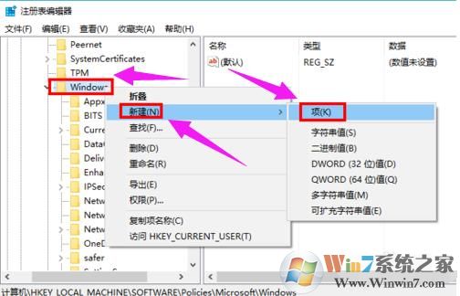3、查看【Windows】项下是否已存在【Windows Search】子项,如果不存在就新建一个。方法是:右键单击【Windows】,依次选择【新建】-->【项】,并命名为“Windows Search”