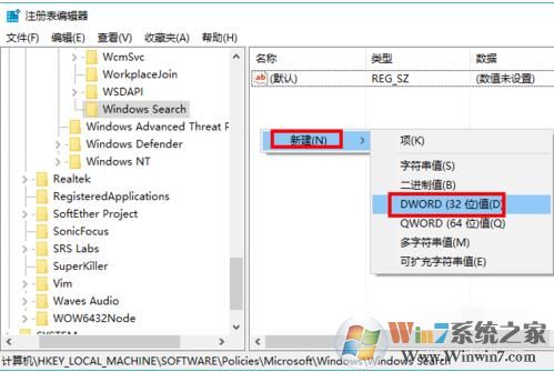 4、选中【Windows Search】项,在右边窗格空白处,右键单击依次选择【 新建】-->【DWORD值】,并命名为“AllowCortana”