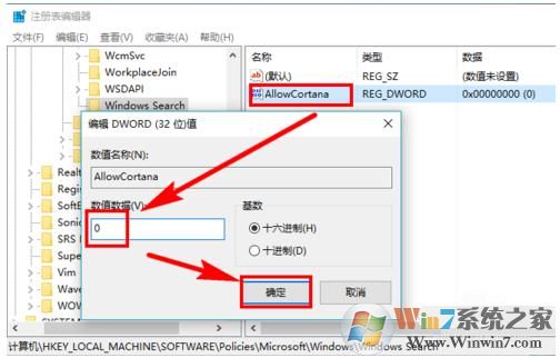 5、双击新建的值【AllowCortana】,查看【数值数据】的值是不是0,如果不是,修改为“0”,点击【确定】,这样小娜Cortana就被禁用了