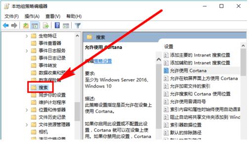 3、这时我们再点击【搜索】后,在右边的窗格中,双击【允许使用Cortana】