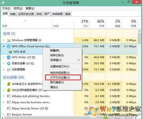1、当出现WPS热点弹出来的时候,此时我们右键点击任务栏,打开任务管理器,就可以看到WPS热点的进程,右键点击打开文件位置;