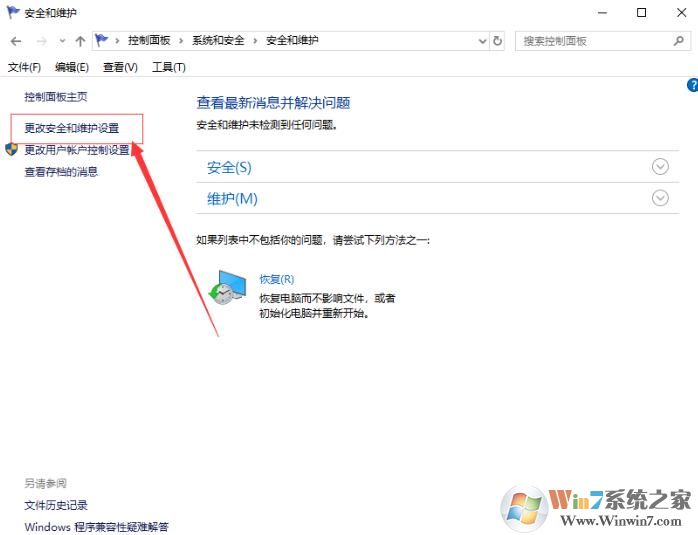 2.选择左下角的安全维护 ——>更改用户账户控制 ;