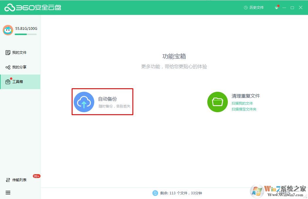 1、打开360安全云盘,点击左侧的“工具箱”,然后点击“自动备份”