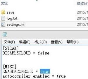 1、首先,找到游戏的用户配置文件,一般是和用户存档文件在一起(也有特殊情况),可以看到一个名为setting.ini文件,如果找不到,可以用F3搜索文件名。用记事本打开,将ENABLECONSOLE = false中的false改成true然后保存退出。